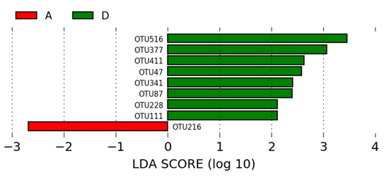 Of the OTUs identified in the intestinal microbiota of animals in the group A (positive control) and the group D (MCSP—basal diet with multiple strain colonizing probiotic), nine OTUs were statistically different between the two groups and had an LDA score > 2. The most significant OTU in the microbiota of animals in the positive control group was Lactobacillus (OTU216). In the group D, the most significant OTUs were Lactobacillus and Clostridiales* (OTU516, OTU377, OTU411, OTU47, OTU341, OTU87, OTU111, and OTU228*) (Figure 8).