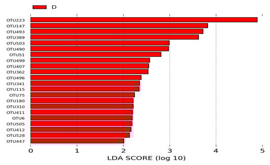 Among the OTUs identified in the intestinal microbiota of animals from the B (negative control) and D groups, 22 OTUs were statistically different between the two groups and had an LDA score > 2. OTU was more significant in the microbiota of the animals from the group B. Lactobacillus (OTU223, OTU147, OTU493, and OTU389) and Corynebacterium (OTU6) were the most significant OTUs in the microbiota of animals from the group D (Figure 9).