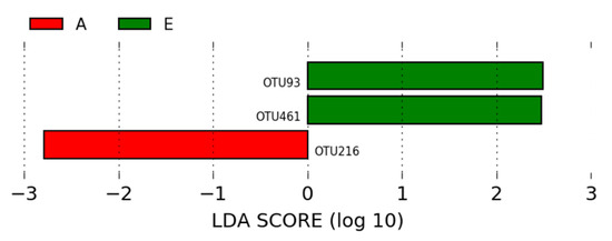 Of the OTUs identified in the intestinal microbiota of animals from the A (positive control) and E (NCSSP—basal diet with non-colonizing single strain probiotic) groups, three OTUs showed statistically significant differences between the two groups, with an LDA score > 2. The most significant OTU in the microbiota of animals from the positive control group was Lactobacillus (OTU216). Lactobacillus (OTU93) and Chloroplast (OTU461) were the most significant OTUs in the microbiota of animals from group E (Figure 10).