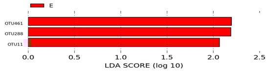 In contrast, in the microbiota of animals from the B (negative control) and E (NCSSP—basal diet with non-colonizing single strain probiotic) groups, three OTUs were statistically different between the two groups and had an LDA score > 2. No OTU was more significant in the microbiota of the animals from the group B. Chloroplast (OTU461), Achromobacter (OTU288), and Ochrobactrum (OTU11) were the most significant OTUs in the microbiota of animals from the group E (Figure 11).