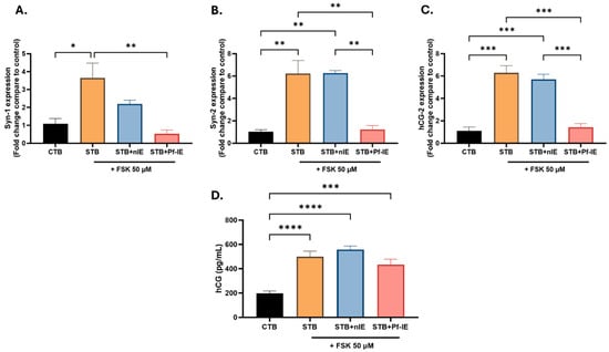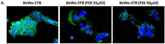 Cells were seeded in 96-well plates, an 8-well Lab-TeckTM chamber (Thermo Scientific, Waltham, MA, USA), and 6-well culture plates at densities of 20,000, 50,000, and 500,000 cells per well, respectively, and allowed to adhere and adapt overnight before treatment. Cells were exposed to 25 μM or 50 μM of Forskolin (FSK) from Santa Cruz (Dallas, TX, USA), for 48 h, to induce syncytialization, and the culture medium containing FSK was renewed daily. After 48 h, the supernatants were collected and kept at −20 °C until analysis. The cells were washed with PBS and fixed in 4% paraformaldehyde (P6148, St. Louis, MO, USA) for immunofluorescent staining. In another set of experiments, cells were detached using trypsin, and RNA was extracted and stored at −80 °C for gene expression analysis using RT-PCR.