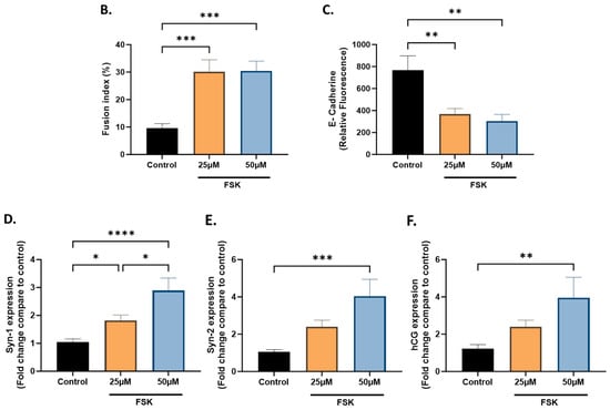 BeWo cell fusion in the presence of FSK. (A) Immunofluorescence staining for E-cadherin (green) and nuclei (blue) of cultured BeWo cells under treatment with FSK (25 μM and 50 μM, 400×). (B) Mean fluorescence intensity of E-cadherin in control cells and FSK treatments. (C) Syncytialization index in control cells and FSK treatments. (D) Expression of SYN-1 showed a 2.65-fold increase in cells treated with 50 μM FSK compared to the control. (E) Expression of SYN-2 showed a 4.04-fold increase in cells treated with 50 μM FSK compared to the control. (F) Expression of βhCG gene indicated a 3.32-fold increase in cells treated with 50 μM FSK compared to the control (n = 3). Data are presented as mean ± SEM. ANOVA, p-value: <0.00001 (****), <0.0001 (***), <0.001 (**), and <0.005 (*).