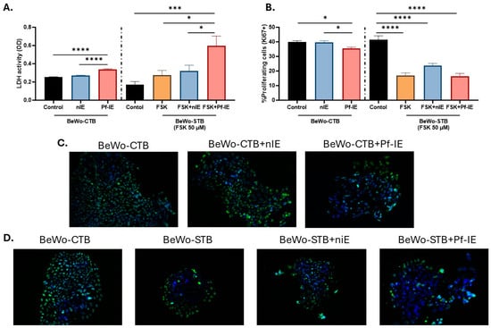 Cell viability and proliferation in BeWo cells exposed to P. falciparum-IE. (A) LDH activity was measured in the culture supernatant of BeWo-CTB and BeWo-STB cells exposed to infected erythrocytes as a marker of cytotoxicity. (B) Percentage of proliferative cells (Ki67-positive cells) in BeWo-CTB and BeWo-STB cultures exposed to P. falciparum-IE. (C) Representative images of Ki-67 (green) and nuclei (blue) immunostaining in BeWo-CTB (100X). (D) Representative images of Ki-67 (green) and nuclei (blue) immunostaining in BeWo-STB (100X). Results are presented as mean ± SEM (n = 3). Test: ANOVA, p-value: <0.00001 (****), <0.0001 (***) and <0.005 (*).
