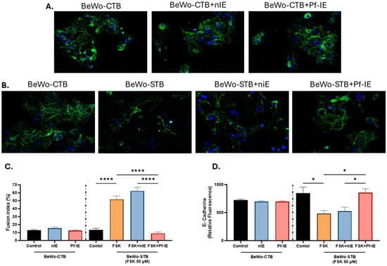 The impact of P. falciparum-IE on BeWo cells was assessed by co-exposing the cells to P. falciparum-IE and FSK. Unsyncytialized BeWo cells were used as a control. Cells were plated and allowed to adhere to culture plates overnight. The following day, they were washed and simultaneously treated with 50 µM FSK and a parasite suspension for 24 h. Subsequently, parasites were removed, and the cells were incubated once again for an additional 24 h in the presence of 50 µM FSK to complete 48 h of FSK treatment. The parasite suspension was prepared at a parasitemia of 10% and a hematocrit of 3%, using mature stages of parasites (trophozoites and schizonts) recovered from culture through gelatin flotation [21].