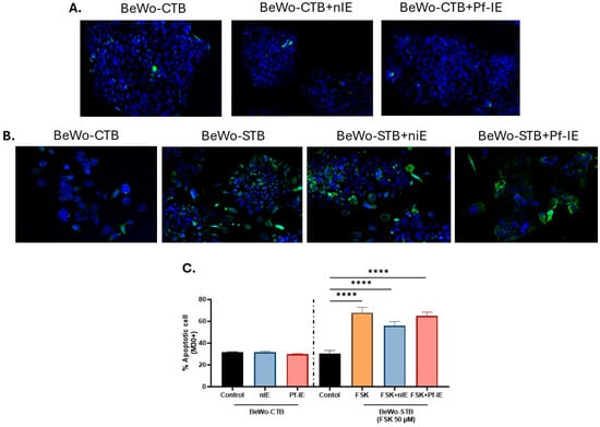 The M30 antibody recognizes a neoepitope of cytokeratin 18 formed by caspase-3 cleavage and thus was used to evaluate the apoptosis in the epithelial cells. Based on the number of M30-positive cells, under control conditions, BeWo cells showed a rate of apoptosis of 30%, which increased to 60% under FSK treatment, indicating higher apoptosis in STB-differentiated cells than in undifferentiated CTB. The higher apoptotic rate of STB remains unaffected after exposure to P. falciparum-IE. The percentage of cells stained positive to M30 was 67.8 ± 4.9% and 64.82 ± 3.69% in STB and STB exposed to parasites, respectively (Figure 5). The treatment of BeWo-CTB cells to parasites without co-treatment with FSK did not affect the apoptosis rate.