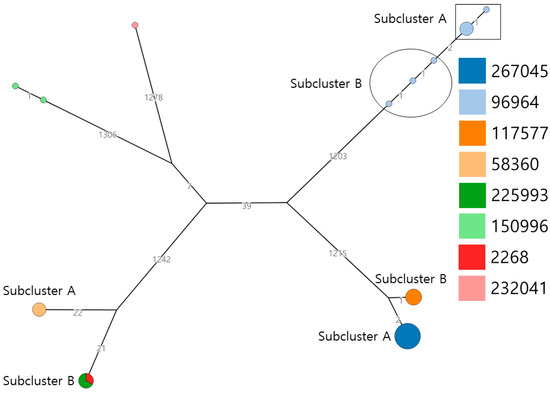 Of the 53 tested Salmonella, five different Salmonella serovars were identified: S. Infantis (30/53, 56.6%), S. Enteritidis (11/53, 20.8%), S. Virchow (9/53, 17.0%), S. Agona (2/53, 3.8%), and S. Indiana (1/53, 1.9%). These five Salmonella serotypes belonged to distinct sequence types: S. Infantis, S. Enteritidis, S. Virchow, S. Agona, and S. Indiana belonged to ST32, ST11, ST16, ST13, and ST17, respectively. Fifty-three Salmonella isolates were identified from eight core genome sequence types (cgSTs) (Figure 1). Salmonella Infantis isolates were identified in two cgSTs (eight cgST117577 and 22 cgST267045), S. Enteritidis was identified in three cgSTs (four cgST225993, two cgST2268, and five cgST58360), S. Virchow was identified in cgST96964, S. Agona was identified in cgST150996, and S. Indiana was identified in cgST232041. Each serotype was divided into four clusters (S. Infantis, S. Enteritidis, S. Virchow, and S. Agona) and one singleton (S. Indiana). Three clusters (S. Infantis, S. Enteritidis, and S. Virchow) were further classified into two subclusters each. Salmonella Infantis was classified based on cgSTs (cgST117577 and cgST267045). Salmonella Enteritidis clusters were classified based on cgST and origin (i.e., subcluster A was identified as cgST58360 and was isolated from chicken meat, whereas subcluster B was identified as cgST225993 and cgST2268 and was isolated from duck meat). The S. Virchow cluster was separated based on allelic differences.