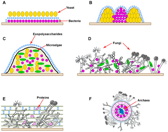 Scheme of different types of polymicrobial biofilms containing various fungi: microorganisms can coexist having a layer-by-layer arrangement (A), they can be mixed partially (B) or deeply (C) when one type of cell is located in the upper layer, and another type in the lower (D); the fungal spores can appear in the biofilm matrix (E), or fungi can cover the layers formed by other cells (F).