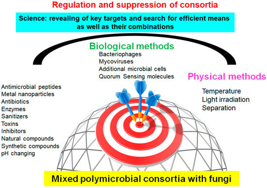 At the same time, the knowledge gained can be extrapolated to other consortia, the activity of which must be eliminated in those processes where they cause a negative effect. This review is aimed at analyzing approaches to the suppression of polymicrobial consortia and their effectiveness. Publications carried out over the past 10 years that focused on the suppression of polymicrobial consortia were taken into account mainly to analyze existing developments and trends in their development. The articles were searched in several scientific databases (https://scholar.google.com, https://pubmed.ncbi.nlm.nih.gov—the last accessed 1 June 2024) by using combinations of the following keywords: mixed polymicrobial consortia, mixed biofilms, fungal consortia, etc.