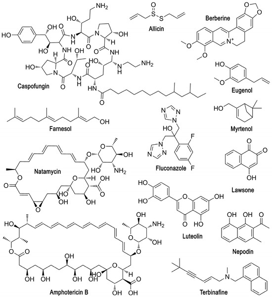 Lawsone (2-hydroxy-1,4-naphthoquinone), extracted from henna leaves or water hyacinth flowers, is used as a dye. However, it turned out that at a concentration of 35 µg/mL lawsone exhibits antimicrobial activity against yeast-bacterial biofilms of C. albicans/E. coli, while it also acted quite selectively, effectively inhibiting the aggregation of C. albicans yeast cells and the formation of hyphae by them, thereby disrupting biofilm formation [37]. It is known that secondary plant metabolites in the form of terpenoids, alkaloids and various organic acids can exhibit fungicidal properties. For example, the production of mycotoxins that protect fungi, including those in fungal consortia, is inhibited by L-pyroglutamic acid at the level of transcription of proteins necessary for their synthesis [106].