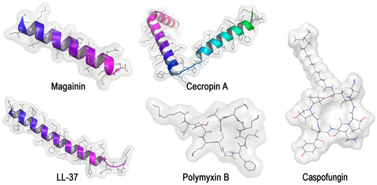 Representation of some AMPs mentioned in Table 2. Structures were obtained from PDB (4MGP and 5NNM) and Uniprot (P01507) and visualized using PyMol (ver. 1.7.6, Schrödinger, LLC, New York, NY, USA).