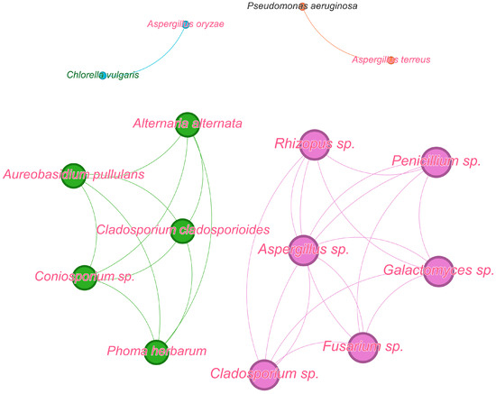| Alternarla, Cladosporium, Fusarium, Pénicillium, Phoma, Trichoderma and Ulocladium genera [59] * | Co-colonization, wooden constructions | Commercial wood preservatives: “Borolitas”, “WT Sodium Hypochlorite; “Anti-mould liquid”, “Boramon”, “Arlitas”, “Complete Wood Treatment” | Alternaria and Fusarium were the most tolerant to wood preservatives, whereas growth of Penicillium cells was suppressed |
