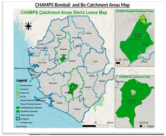 The Child Health and Mortality Prevention Surveillance Network (CHAMPS) is a global surveillance network that generates, collects, analyzes, and shares data to reduce child mortality in regions where it is highest—Sierra Leone, Mali, Nigeria, Ethiopia, Kenya, Mozambique, and South Africa in Sub-Saharan Africa; and Pakistan and Bangladesh in Asia. The first CHAMPS site in Sierra Leone is located in Bombali Shebora and Siari chiefdoms in the Bombali District (Northern Province) (Figure 1 below). The Makeni site includes parts of Makeni City (population 125,970) as well as peri-urban and rural areas (population 36,413), resulting in a total site population of 161,383 [18]. The CHAMPS catchment area makes up approximately 25% of the total district population. The estimated population of children under five years of age under surveillance in the catchment area is approximately 24,000, with an approximate under-five mortality rate of 119/1000 live births, a crude birth rate of 32.4 livebirths per 1000 population, and a fertility rate of 4.6/1000 women [18,19].