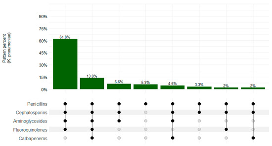 Among K. pneumoniae isolates, 138/152 (90.8%) presented an MDR pattern. Overall, resistance to penicillin–cephalosporins–aminoglycosides–fluoroquinolones was the most common pattern (61.8%; 94/152), as shown in Figure 2.
