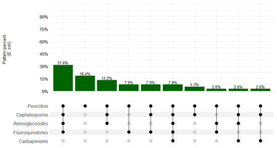 Figure 3 summarizes the resistance patterns among E. coli isolates. The MDR pattern was observed in 26/40 (65.0%) isolates, with the most common pattern of resistance as follows: penicillins–cephalosporins–aminoglycosides–fluoroquinolones in 31.6% (12/38) of the isolates.