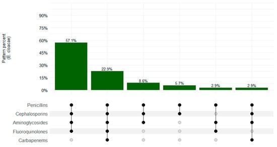The MDR pattern was observed in 33/35 (94.3%) E. cloacae isolates, and the most common pattern of resistance was penicillins–cephalosporins–aminoglycosides–fluoroquin–olones–carbapenems (20/35; 51.7%), as shown in Figure 4.