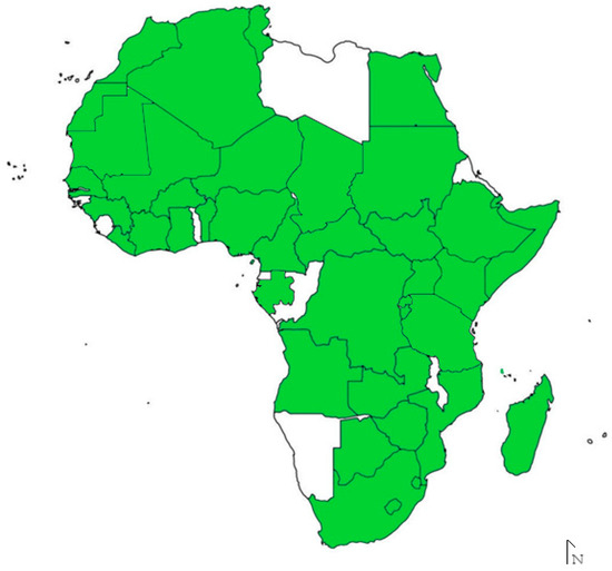 Distribution of Rickettsia africae in Africa based on detection in either vector ticks or human hosts. White shaded areas indicate countries where R. africae has not been detected or investigated. Image was constructed with information obtained from Genbank, Mazhetese, et al. [21], Pillay, et al. [24] and Zhang, et al. [25].