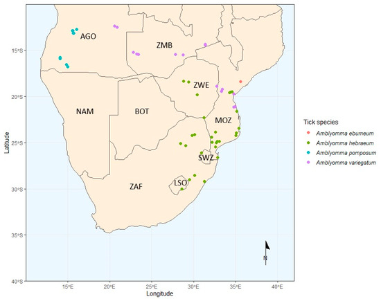 Map of southern Africa, illustrating the Amblyomma spp. collection points during the 2020–2022 sampling period performed by Smit et al. [41]. The colour of the dots represents the species of Amblyomma spp. ticks collected at the respective sampling points. Country codes: AGO—Angola, BOT—Botswana, LSO—Lesotho, MOZ—Mozambique, NAM—Namibia, SWZ—Eswatini, ZAF—South Africa, ZMB—Zambia, and ZWE—Zimbabwe.