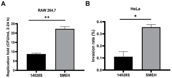 3.4. S. Mbandaka SMEH Promotes Intracellular Survival and Invasion
