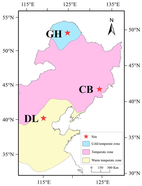 This study selected three representative temperate forest ecosystems in northern China as research areas: the Dongling Mountains warm temperate deciduous broad-leaved forest (DL) (39°58′ N, 115°26′ E), the Changbai Mountains temperate broad-leaved red pine forest (CB) (42°38′ N, 128°08′ E), and the Greater Hinggan Mountains cold temperate coniferous forest (GH) (51°49′ N, 122°59′ E). These three research areas represent warm temperate, mid-temperate, and cold temperate forest ecosystems, respectively, distributed along a latitudinal gradient from south to north (Figure 1). The study plots in these three areas cover 20 hectares, 25 hectares, and 25 hectares, respectively. All studies and determinations pertaining to earthworm skin, gut, and habitat soil were conducted across the three distinct forest ecosystems.