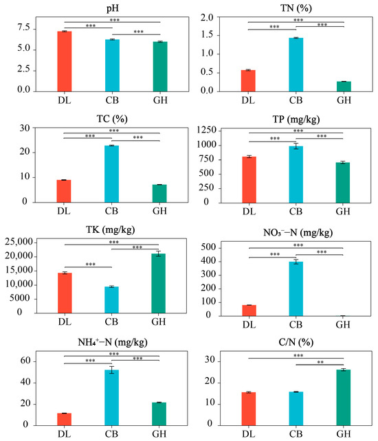 Soil physicochemical properties in three temperate forest types. DL, Dongling Mountains Warm temperate deciduous broad-leaved forest; CB, Changbai Mountains Temperate broad-leaved red pine forest; GH, Greater Hinggan Mountains Cold temperate coniferous forest; TN, total nitrogen; TC, total carbon; TP, total phosphorus; TK, total potassium; NO3−-N, nitrate nitrogen; NH4+-N, ammonium nitrogen; C/N, carbon–nitrogen ratio. Significant differences are indicated by asterisks based on the nonparametric Kruskal–Wallis test: ** p < 0.01 and *** p < 0.001.