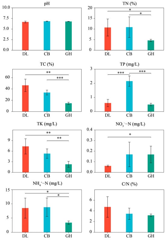 Physicochemical properties of earthworm epidermal mucus in three temperate forest types. DL, Dongling Mountains Warm temperate deciduous broad-leaved forest; CB, Changbai Mountains Temperate broad-leaved red pine forest; GH, Greater Hinggan Mountains Cold temperate coniferous forest; TN, total nitrogen; TC, total carbon; TP, total phosphorus; TK, total potassium; NO3−-N, nitrate nitrogen; NH4+-N, ammonium nitrogen; C/N, carbon–nitrogen ratio. Significant differences are indicated by asterisks based on the nonparametric Kruskal–Wallis test: * p < 0.05, ** p < 0.01, and *** p < 0.001.
