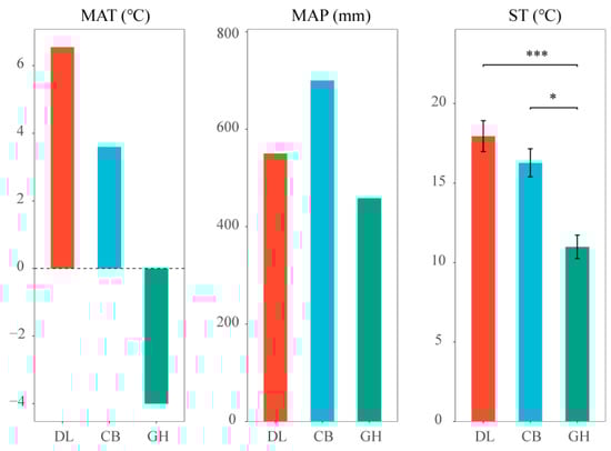 MAT, MAP, and ST in three temperate forest types. DL, Dongling Mountains Warm temperate deciduous broad-leaved forest; CB, Changbai Mountains Temperate broad-leaved red pine forest; GH, Greater Hinggan Mountains Cold temperate coniferous forest; MAT, mean annual temperature; MAP, mean annual precipitation; ST, soil temperature. Significant differences are indicated by asterisks based on the nonparametric Kruskal–Wallis test: * p < 0.05 and *** p < 0.001.