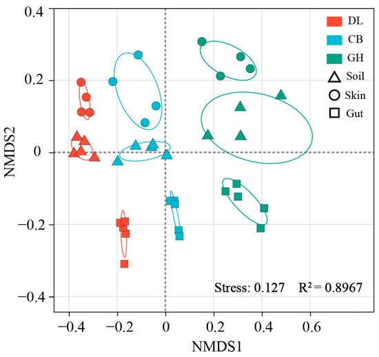 Non-metric multidimensional scaling (NMDS) ordination revealed significant differences in bacterial community structures of earthworm skin, gut, and habitat soil across the three temperate forest types (PERMANOVA, p < 0.001) (Figure 6). The transition from DL to GH significantly influenced the bacterial community structures in earthworm skin, gut, and habitat soil (ANOSIM and PERMANOVA, p < 0.05) (Table 1). PERMANOVA analysis indicated that the transition from DL to GH exerted the most substantial influence on the bacterial community structure of earthworm gut (R2 = 0.471–0.596), followed by the earthworm habitat soil (R2 = 0.326–0.38), while the impact on the bacterial community structure of earthworm skin was comparatively less pronounced (R2 = 0.322–0.329) (Table 1).