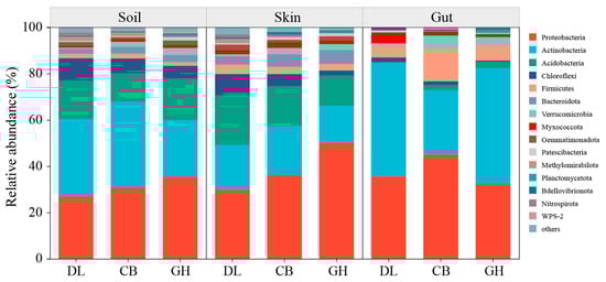 In the three temperate forests investigated, Actinobacteria and Proteobacteria were the predominant bacterial phyla in the earthworm skin, gut, and habitat soil. Additionally, Acidobacteria and Chloroflexi exhibited relatively high abundances in the earthworm habitat soil and skin. However, the bacterial community composition in the earthworm gut displayed significant differences compared to that of the soil and skin, with Firmicutes and Verrucomicrobia presenting higher relative abundances in the earthworm gut (Figure 7).