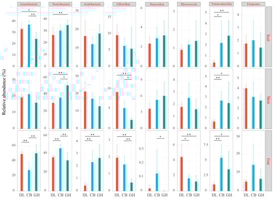 Variations in the relative abundance of dominant bacterial phyla across three temperate forests. DL, Dongling Mountains Warm temperate deciduous broad-leaved forest; CB, Changbai Mountains Temperate broad-leaved red pine forest; GH, Greater Hinggan Mountains Cold temperate coniferous forest. Significant differences are indicated by asterisks based on the nonparametric Kruskal–Wallis test: * p < 0.05 and ** p < 0.01.