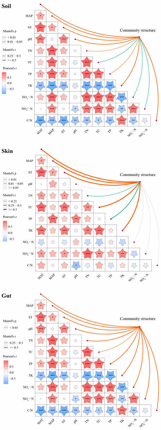 Mantel test results revealed complex relationships between environmental factors and bacterial community structures in earthworm skin, gut, and habitat soil (Figure 9). Firstly, climatic factors, including MAT, MAP, and ST of earthworm habitats, exhibited significant correlations with bacterial community structures in earthworm skin, gut, and habitat soil (p < 0.01). Secondly, soil physicochemical properties not only significantly correlated with bacterial community structures in earthworm habitat soil (p < 0.05) but also demonstrated stronger correlations with bacterial community structures in earthworm gut (p < 0.01). Furthermore, upon analyzing the physicochemical characteristics of earthworm skin mucus, we found that four key indicators—TN, TC, TP, and TK—also showed significant correlations with bacterial community structures in earthworm skin (p < 0.05). Collectively, these results suggest that climatic factors, soil properties, and the physiological characteristics of earthworms themselves may exert substantial influences on their associated microbial community structures.