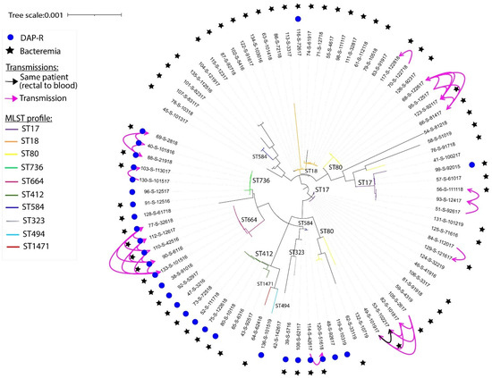 A total of 28 strains (34%) were resistant to daptomycin, identified both computationally and phenotypically (as described above). Computationally, these strains harbored both chromosomally encoded LiaRW73C and LiaST120A substitutions, which confer daptomycin resistance (Table 2) [20]. Other mutations identified in three DR-VRE strains were located on the phospholipid biosynthesis enzyme cardiolipin synthase (cls) gene, including D27N and H215R [20,21]. The DR-VRE strains were isolated from 8 ICU patients, 9 HCT recipients, and 11 leukemia patients. Most of the DR-VRE strains belonged to either ST736 (8/28) or ST664 (7/28). These two STs were exclusively associated with daptomycin resistance in both our 2012 and 2015–2019 cohorts (Figure 1 and Figure S1). One pair consisted of a rectal swab strain and a blood strain isolated from the same patient and sharing high genetic relatedness (Figure 1). Additionally, all DR-VRE strains isolated from the ICU belonged to ST736 and were isolated from blood cultures. Of note, 13 of the 28 patients (46%) with DR-VRE were exposed to daptomycin for 1 to 22 days within 1 year of isolation of VRE; the remaining patients had no prior exposure to daptomycin within 1-year prior of VRE isolation, indicating a probable horizontal transmission between patients and between different floors. Among the 28 patients with DR-VRE strains, 22 patients died—15 within 30 days and 6 at a median of 3 months (interquartile range, 1–3 months) after positive blood cultures. One patient died 11 months after a DR-VRE strain was isolated from a rectal swab.