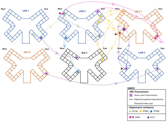 A total of 22 of the VRE strains isolated from different hospital floors (leukemia, 9/22; HCT, 7/22; and ICU, 6/22) were highly genetically related, differing by five SNPs or less (Figure 2, Figures S3 and S4). These VRE strains belonged to ST17 (n = 6), ST80 (n = 6), ST664 (n = 5), ST736 (n = 3), or ST584 (n = 2). Around 36% of these potential horizontal transmissions were due to DR-VRE strains, with clonal isolation of ST736, ST664, and ST584 strains occurring between units and patients at a median of 206 days (range: 1 day to 2 years) after colonization or infection was found in a potential index patient (Figure 2).