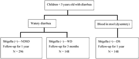 The inclusion criteria are as follows: (1) children between >1 month and <60 months of age seeking care at the KH for diarrhea; and (2) children residing in the catchment area of the KH and willing to be available for sample and data collection during the scheduled visits. In addition, children in the NDSD and DS groups with stool samples positive for Shigella according to the RLDT will be included. The exclusion criteria are as follows: (1) children whose diarrhea episode started more than 72 h before enrolment; (2) children who have taken antibiotics within the last 3 days; (3) children with severe acute malnutrition (below the −3 Z score of the median WHO growth standards); and (4) children with another significant disease process requiring specific therapy. In addition, for the NDSD and WD groups, children showing the presence of visible blood in their stool will be excluded.
