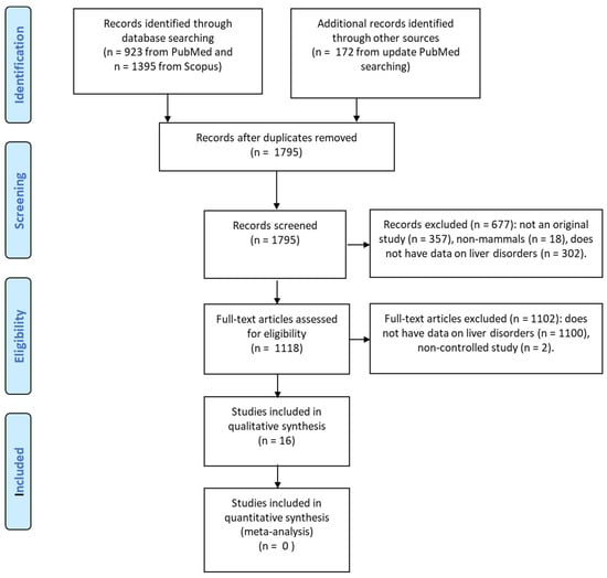 After excluding all irrelevant publications, the systematic review included sixteen studies: ten experimental animal studies (EASs) and six randomized controlled trials (RCTs) in humans (Figure 1, Table 1, Table 2 and Table 3) [,,,,,,,,,,,,,,,]. There were single EASs on giardiasis, Salmonella enteritis infection, obstructive jaundice, and D-galactosamine-induced liver injury. Two EASs were conducted on cirrhosis, and four were conducted on MASLD. Of the six RCTs, two examined SB in cirrhosis, and four examined SB in neonatal hyperbilirubinemia (Table 3).