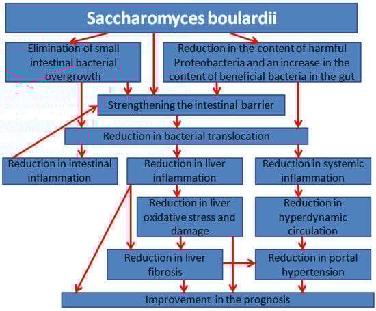 Due to its antagonistic and symbiotic properties, SB eliminates small intestinal bacterial overgrowth and modulates the composition of gut microbiota, reducing the content levels of harmful Proteobacteria and increasing the content levels of beneficial bacteria, which strengthen the intestinal barrier. Strengthening the intestinal barrier and reducing the content of harmful bacteria reduces the severity of bacterial translocation into the intestinal wall, liver, and systemic circulation, thereby reducing the severity of systemic, intestinal, and hepatic inflammation. Reducing the severity of intestinal inflammation, in turn, strengthens the intestinal barrier. In addition, reducing hepatic inflammation reduces the severity of oxidative stress, damage, and fibrosis in the liver. In decompensated cirrhosis, reducing systemic inflammation reduces the severity of hyperdynamic circulation; this then reduces the severity of portal hypertension, which reduces the severity of ascites, hepatic encephalopathy, hypoalbuminemia, and hypersplenism, improving the prognoses for patients (Figure 2).