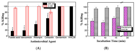 (A) Percent killing of S. aureus by HHC36 and multiple conventional antibiotics for 30 min. * p < 0.05 compared to HHC36 treatment; ^ p < 0.05 compared to the 200 µM treatment of the same antibiotic. (B) Bacterial killing kinetics against S. aureus of HHC36 and gentamicin at 200 µM. * p < 0.05 compared to gentamicin at the same treatment time.