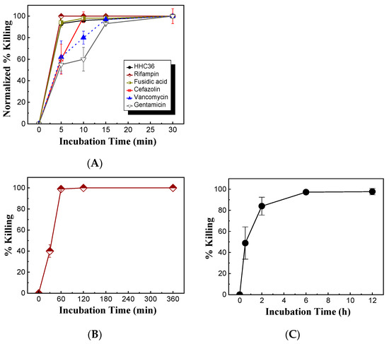 Kinetic studies were conducted for HHC36 at 200 μM and antibiotics at 2 mM at various time intervals (5, 10, 15, and 30 min, or 30, 60, 120, and 360 min, respectively). The kinetics experiments were conducted by adding log-phase bacteria (3 × 105 CFU/mL) and the HHC36 or one of the antibiotics in a total sample volume of 1 mL. After incubating for a certain time, samples (control and treated ones) were diluted and plated on 5% sheep blood agar plates, and the CFU were subsequently determined.