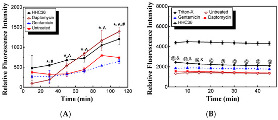 (A) Permeabilization of S. aureus membrane treated with HHC36, daptomycin, gentamicin, and control (untreated) at 2× MIC. * p < 0.05 HHC36 vs. untreated and gentamicin treatment at the same time period; ^ p < 0.05 daptomycin treatment vs. untreated and gentamicin treatment at the same time period. # p < 0.05 HHC36 vs. daptomycin treatment. (B) Depolarization of S. aureus membrane treated with HHC36, daptomycin, gentamicin, Triton-X100, and untreated. The concentrations of HHC36, daptomycin, and gentamicin were 2× MIC. Triton-X100 of 0.1% was used. @ p < 0.005 HHC36 vs. Triton-X100, daptomycin, and untreated; & p < 0.05 HHC36 vs. gentamicin.