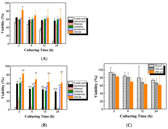 (A) Effects of different antimicrobial agents on the viability of osteoblasts; concentrations of all antimicrobial agents were 200 µM. * p < 0.05 compared to all other antibiotic treatments at 2 h; ^ p < 0.05 compared to fusidic acid treatment at the same culturing time; & p < 0.05 compared to fusidic acid treatment at 2 h; # p < 0.05 compared to fusidic acid treatment at 2, 6, and 12 h. (B) Effects of different antimicrobial agents on the viability of osteoblasts; concentrations of all conventional antibiotics were 2 mM and the concentration of HHC36 was 200 µM. α p < 0.05 compared to fusidic acid treatment at the same culturing time; β p < 0.05 compared to rifampin treatment at the same culturing time; δ p < 0.05 compared to vancomycin, cefazolin, and gentamicin treatments at the same culturing time; θ p < 0.05 compared to cefazolin treatment at the same culturing time; * p < 0.05 compared to cefazolin treatments at 2, 6, and 12 h; @ p < 0.05 compared to fusidic acid treatment at 2 h; &,^ p < 0.05 compared to vancomycin or rifampin treatment at 2 h, respectively; # p < 0.05 compared to cefazolin treatment at 2 h. (C) Effects of culturing time and HHC36 concentration on the viability of osteoblasts.