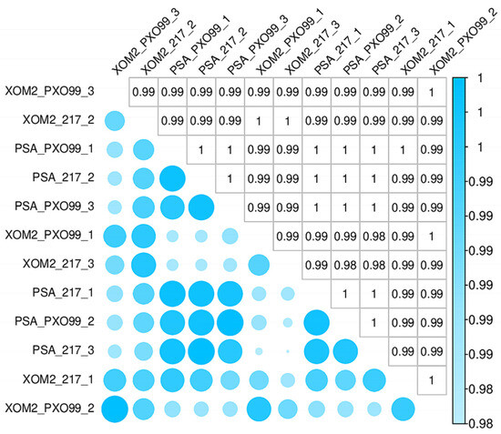 The strains used for transcriptome sequencing were PXO99A and Δtrans217. Bacterial RNA was collected after growth in X. oryzae recipe 2 (XOM2) and polypeptone sucrose agar (PSA) media for virulence induction and normal growth, respectively, with three biological replicates for each sample, totaling 12 samples. After assessing the quality of the RNA samples, libraries were constructed, and RNA-Seq was performed. Following the removal of splice junctions and low-quality reads, 29.02 G of high-quality reads were acquired. Each sample had an effective data volume ranging from 2.32 to 2.54 G, with Q30 base distribution between 93.68% and 94.71%, and a mean GC content of 60.77%. The reference genome was used for aligning the reads, with alignment and mapping rates ranging from 81.0% to 92.0% (Table 1). Correlation analyses of the three biological replicates in different groups yielded correlation coefficients greater than 0.9, indicating high reproducibility in the sequencing results. This high reproducibility ensures the reliability of subsequent evaluations of differentially expressed genes (Figure 1).