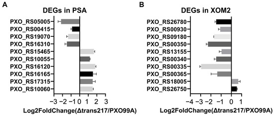 Verification of the transcriptome data by RT-qPCR. Expression levels of DEGs in Xoo PXO99A and a mutant strain lacking sRNA 217 (Δtrans217) grown in a nutrient-rich polypeptone sucrose agar (PSA) medium (A) and nutrient-deficient XOM2 conditions (B).