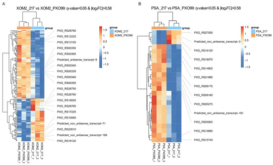 Twenty-four differentially expressed genes were identified in the PSA culture by comparing the transcriptomic data of wild-type PXO99A and Δtrans217 strains according to the DEG screening criteria of FDR ≤ 0.01 and |log2FC| > 0.58. Among these genes, 3 were upregulated and 21 were downregulated. In the XOM2 culture, 135 DEGs were identified, with 52 upregulated and 83 downregulated. When |log2FC| > 1, 6 DEGs were found in the PSA group, all of which were upregulated. In contrast, the XOM2 group showed 33 DEGs, including 7 upregulated and 26 downregulated genes (Figure 3). Overall, there was a predominance of downregulated genes compared to upregulated genes.