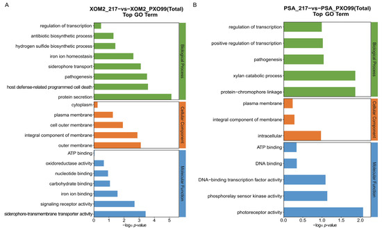 Summary of GO enrichment analysis. Horizontal and vertical axes indicate GO entry name and −log10 p-value, respectively. XOM2 (A) and PSA (B) groups were compared to PXO99A, respectively.
