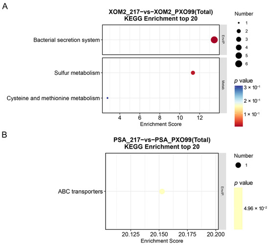 Summary of KEGG enrichment analysis. XOM2 (A) and PSA (B) groups were compared to wild-type strain PXO99A, respectively. Horizontal axis indicates enrichment scores. Entries with more bubbles contain higher number of differentially expressed protein-coding genes, and the colors of the bubbles range from blue to yellow to red. A lower enrichment p-value corresponds to greater significance.
