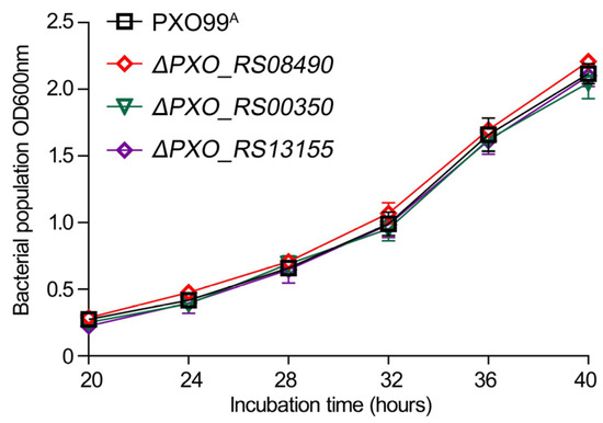 Measurement of the bacterial growth rate of Xoo strains. Xoo PXO99A and deletion mutant strains were cultured on a nutrient medium. The OD600 values represent bacterial cell density. Data at each time point are presented as mean ± SD (n = 5).