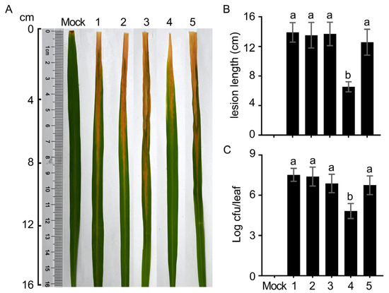 Virulence assessment of Xoo strains. Virulence assessments were conducted on the susceptible rice variety, Nipponbare. The tested strains were PXO99A (1), ΔPXO_RS13155 (2), ΔPXO_RS00350 (3), ΔPXO_RS08490 (4), and CΔPXO_RS08490 (5). (A) Images were captured on day 14 after inoculation using the leaf-clipping method to record bacterial blight symptoms on Nipponbare leaves. (B) Lesion length due to blight was measured (n = 10 leaves). (C) Bacterial populations within Nipponbare leaves were quantified 3 days following infiltration inoculations at the leaf center (n = 3 experimental replicates). Data are presented as mean ± SD. Different lowercase letters denote significant differences based on analysis of variance with Fisher’s least significant difference test (p < 0.01).