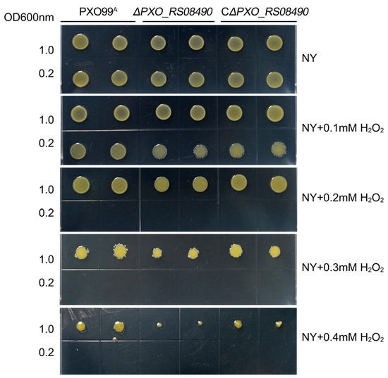 The findings demonstrated that at a final concentration of 0.1 and 0.2 mM H2O2, the OD600 value was 1, and both the WT and mutant strains could grow normally on NY plates. However, low-density bacteria could not grow at 0.2 mM H2O2. When hydrogen peroxide concentration was higher than 0.3 mM H2O2, both WT and mutant strains showed serious growth defects, and ΔPXO_RS08490 strain was more obvious (Figure 9). The complementary strain of ΔPXO_RS08490 (CΔPXO_RS08490) repaired the defect, indicating that the gene was a key factor in the response to exogenous oxidative stress.