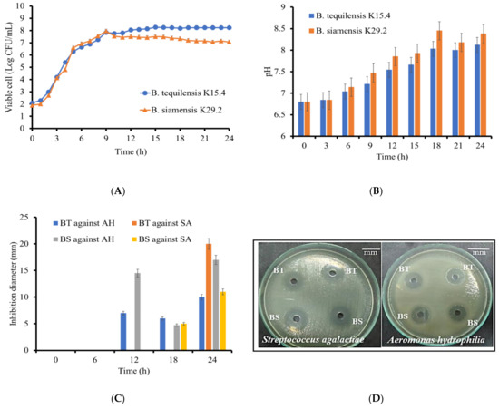 - Meidong, R.; Doolgindachbaporn, S.; Jamjan, W.; Sakai, K.; Tashiro, Y.; Okugawa, Y.; Tongpim, S. A novel probiotic Bacillus siamensis B44v isolated from Thai pickled vegetables (Phak-dong) for potential use as a feed supplement in aquaculture. J. Gen. Appl. Microbiol. 2017, 63, 246–253. [Google Scholar] [CrossRef]