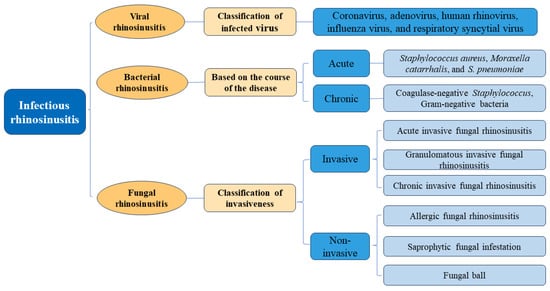 Huang, F.; Liu, F.; Zhen, X.; Gong, S.; Chen, W.; Song, Z. Pathogenesis, Diagnosis, and Treatment of Infectious Rhinosinusitis. Microorganisms 2024, 12, 1690. https://doi.org/10.3390/microorganisms12081690