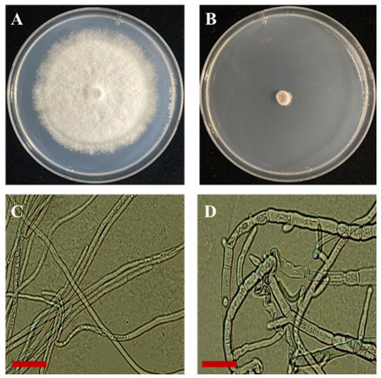 Inhibitory effect of B. subtilis PE7 VOCs on D. bryoniae. (A) Control plate with D. bryoniae only. (B) Plate showing inhibition of D. bryoniae by VOCs from B. subtilis PE7. (C) Normal hyphal structure of D. bryoniae in the control. (D) Twisted and swollen hyphal structure of D. bryoniae affected by VOCs from B. subtilis PE7 (scale bar = 25 µm).